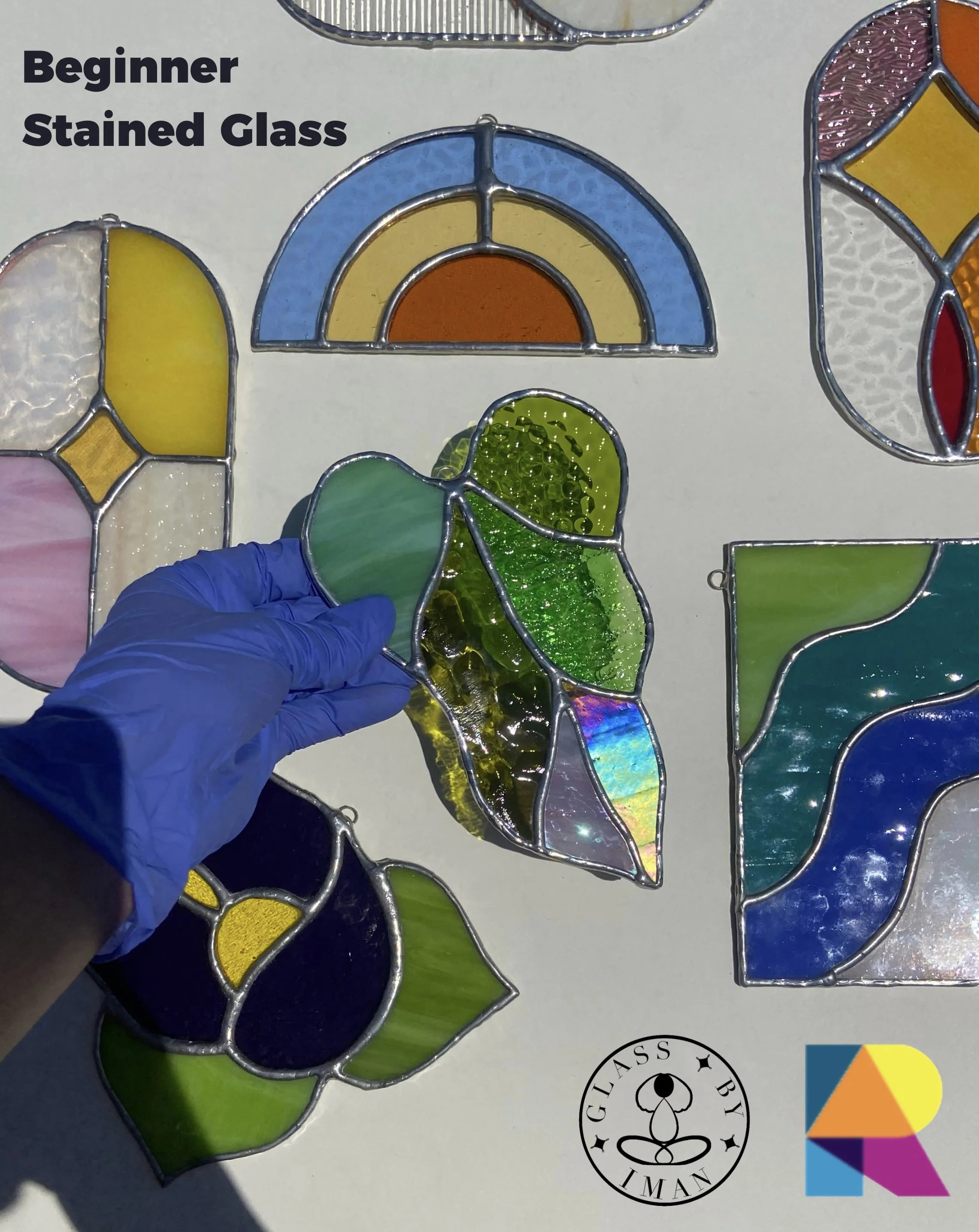 Course Description: Learn stained glass basics from Iman using the Tiffany or copper foil method to create your own unique piece of stained glass artwork. During this four hour course students will learn how to cut shapes from glass sheets, grind on a glass grinder, brandish foil, and solder using a soldering iron. There will be a few different geometric and free-form patterns to choose from. No prior experience required. Traditional leaded solder used in this course.