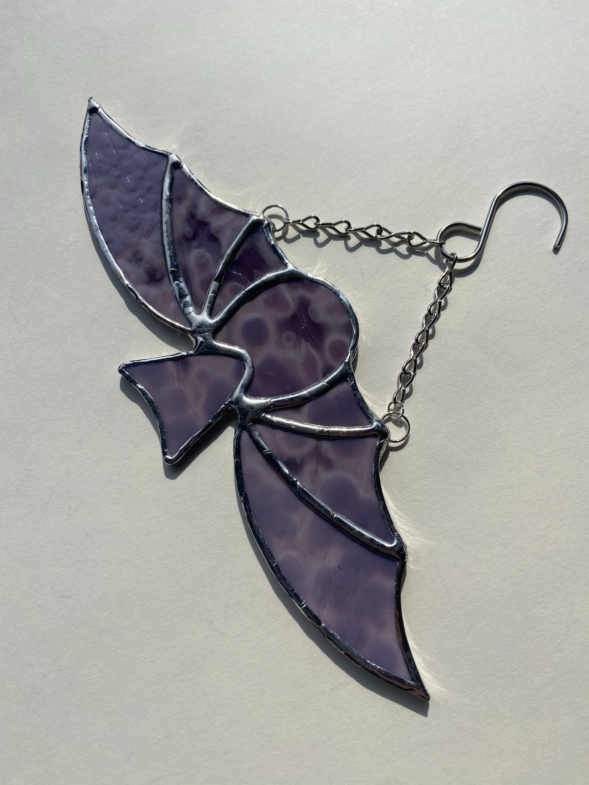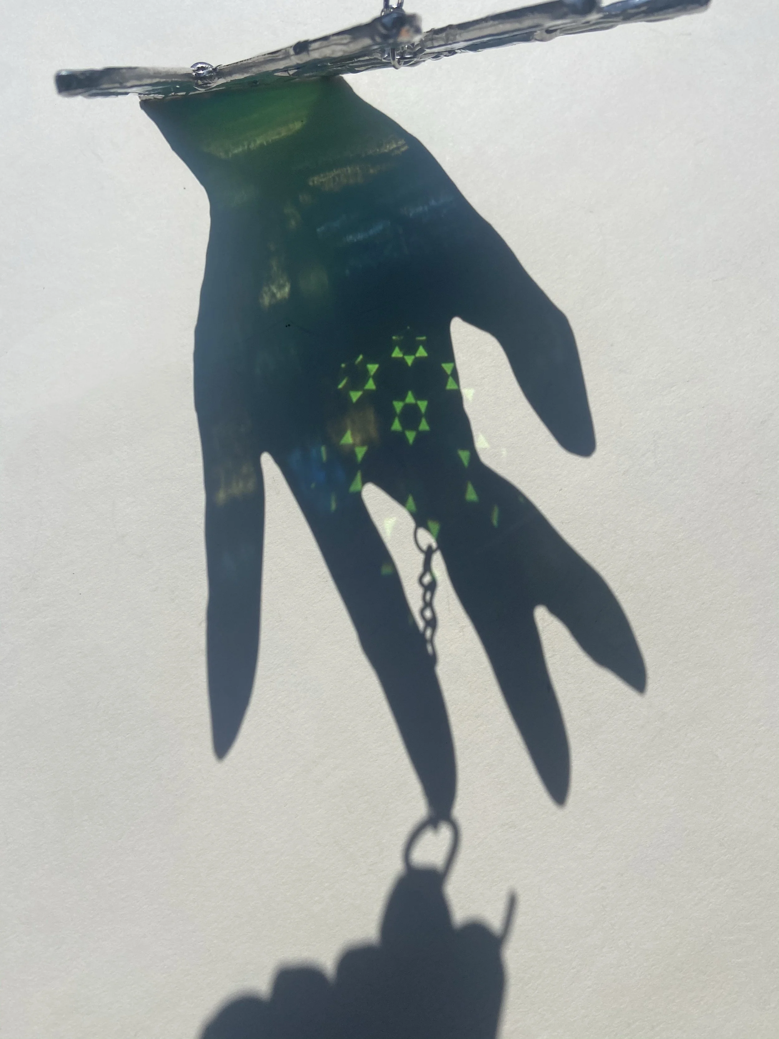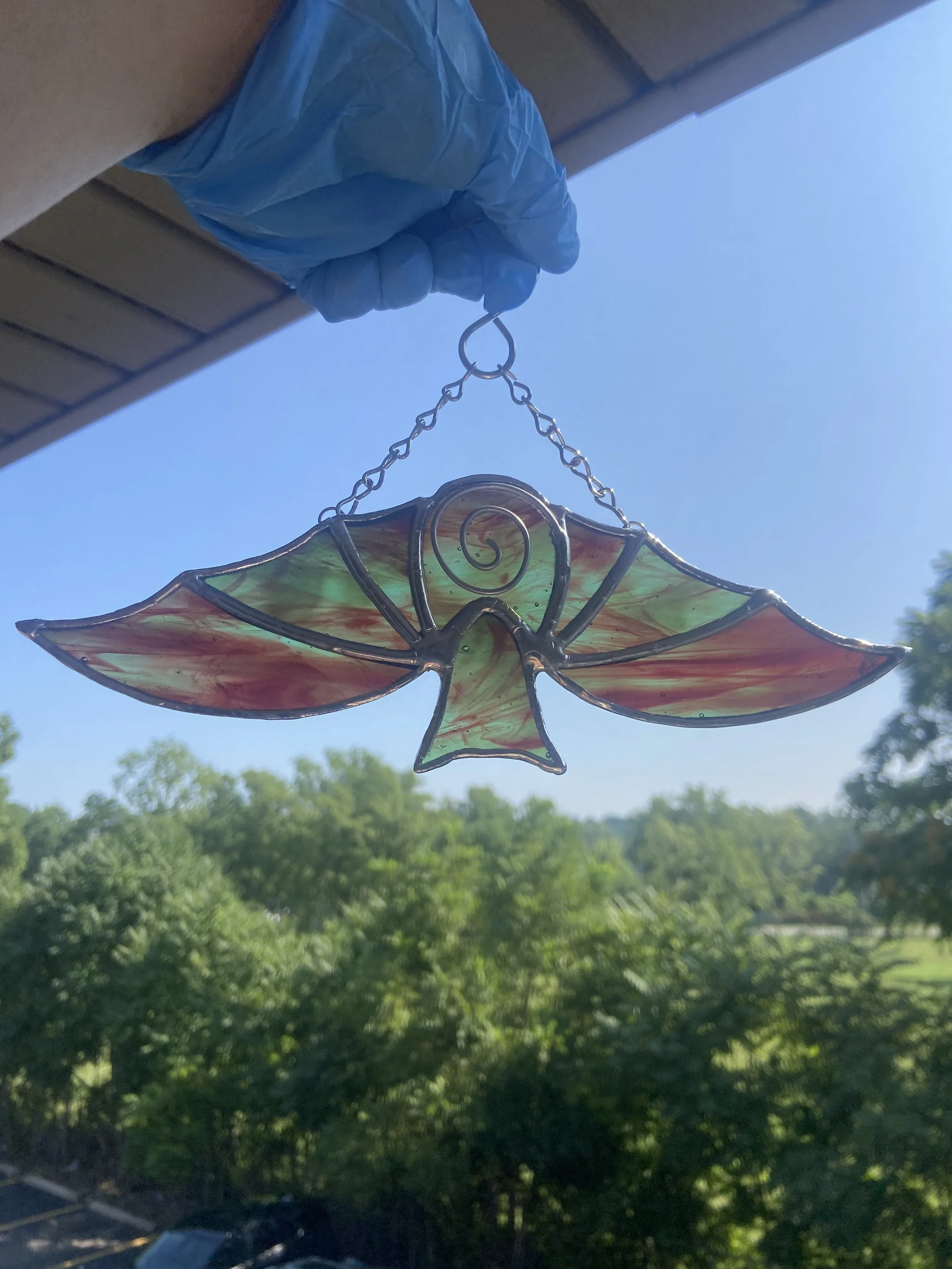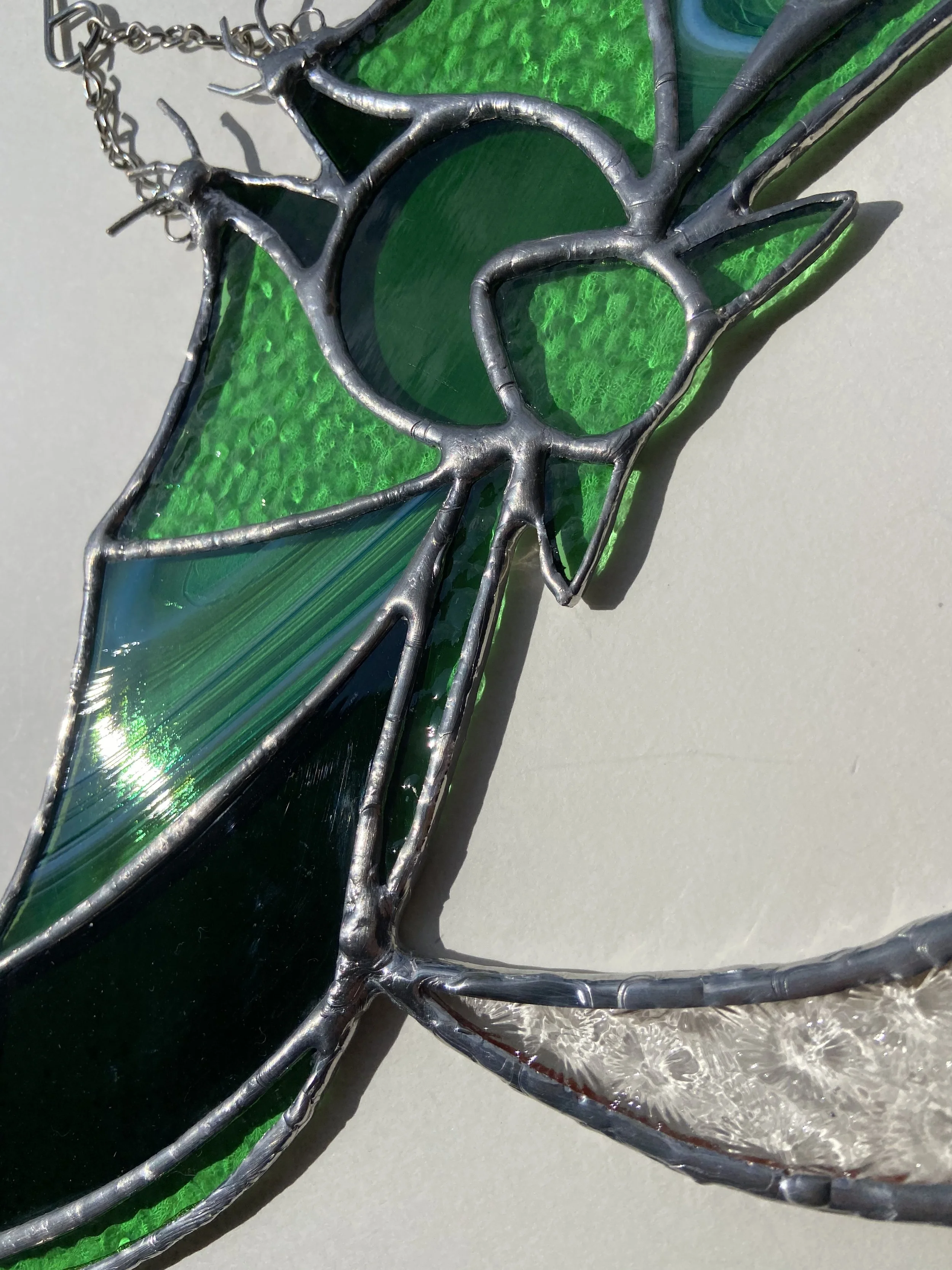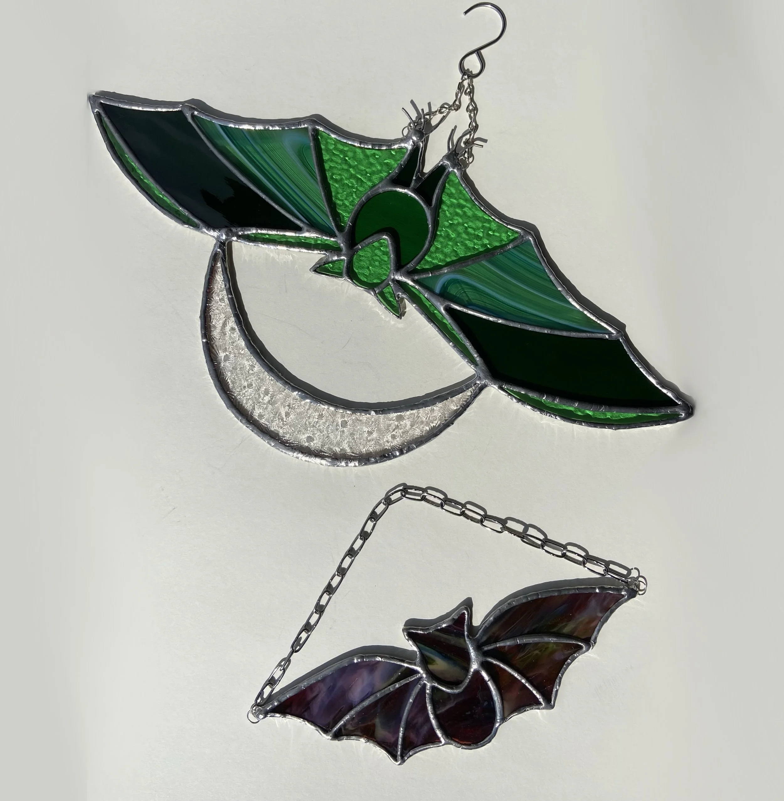 Each piece will come with chains or other hanger to display. Pieces with jack chain can be shortened or lengthened by bending open links with any type of pliers to reach desired length. Most small hanging pieces will require hammering a nail (any nail that you can’t bend by hand) into either wall or wall above window. Heavier pieces that require more equipment will be given further instructions. I don’t recommend suction cups on windows as they often fail even with small pieces.