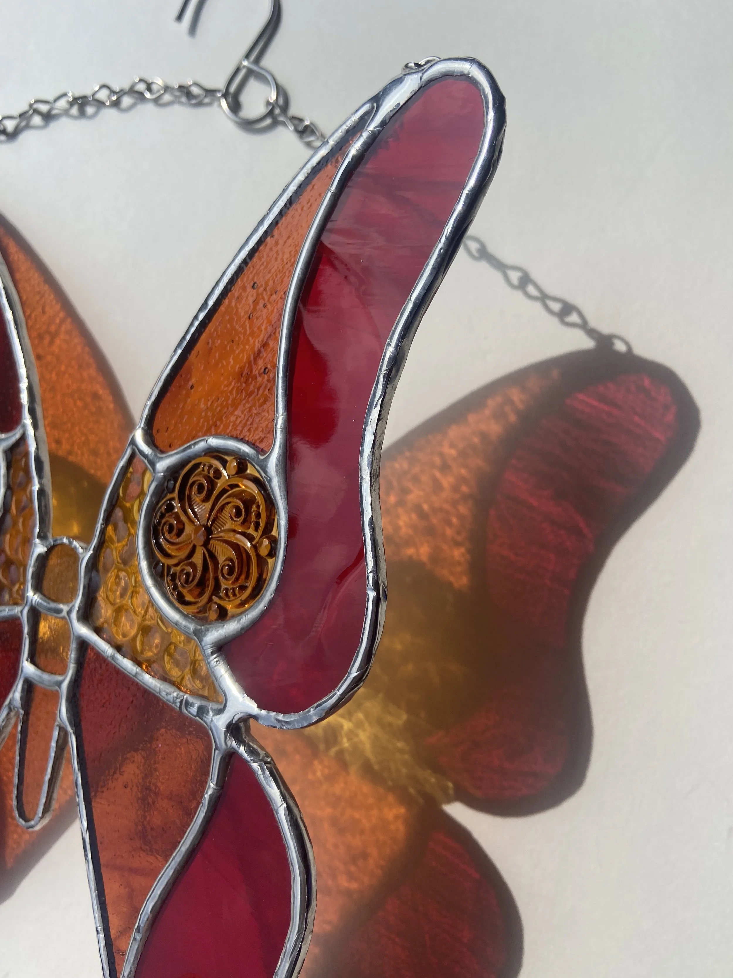 1 of 1 butterfly made with cathedral orange, baroque red and textured gold glass.